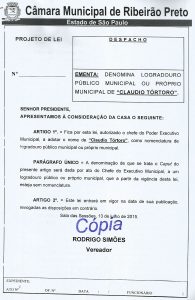 AC TÓRTORO: HOMENAGEM AO MEU PAI , CLAUDIO TÓRTORO Meu amigo/irmão, Vereador RODRIGO SIMÕES apresentou à consideração da Câmara Municipal de Ribeirão Preto Projeto de Lei indicando o...