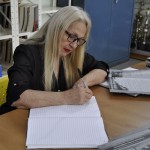 A bibliotecária Deise recebeu exemplar do livro que veio enriquecer o acervo de mais de dois mil títulos.
