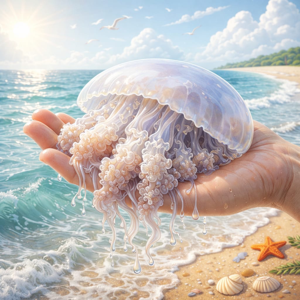 ÁGUA-VIVA nasceu de um instante real e delicado: o momento em que segurei uma água-viva nas mãos. Ali, entre o fascínio e o medo, percebi que eu tinha o poder de deixá-la continuar viva… ou não. O poema reflete esse limite invisível entre cuidado e destruição, entre o toque humano e a fragilidade da vida. Um encontro breve, mas profundo, com a responsabilidade que carregamos ao tocar o que é vivo.
