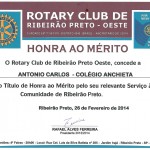 Na noite de 26 de fevereiro de 2014, o Orientador Educacional e Coordenador de Eventos do Colégio Anchieta, Prof. Antonio Carlos Tórtoro, (representando o Colégio) recebe das mãos do Presidente do Rotary Club de Ribeirão Preto – Oeste, Rafael Alves Ferreira, o certificado de Honra ao Mérito pelo relevante serviço prestado à comunidade de Ribeirão Preto durante a campanha “Faça uma criança feliz – doe brinquedos – 2013”.